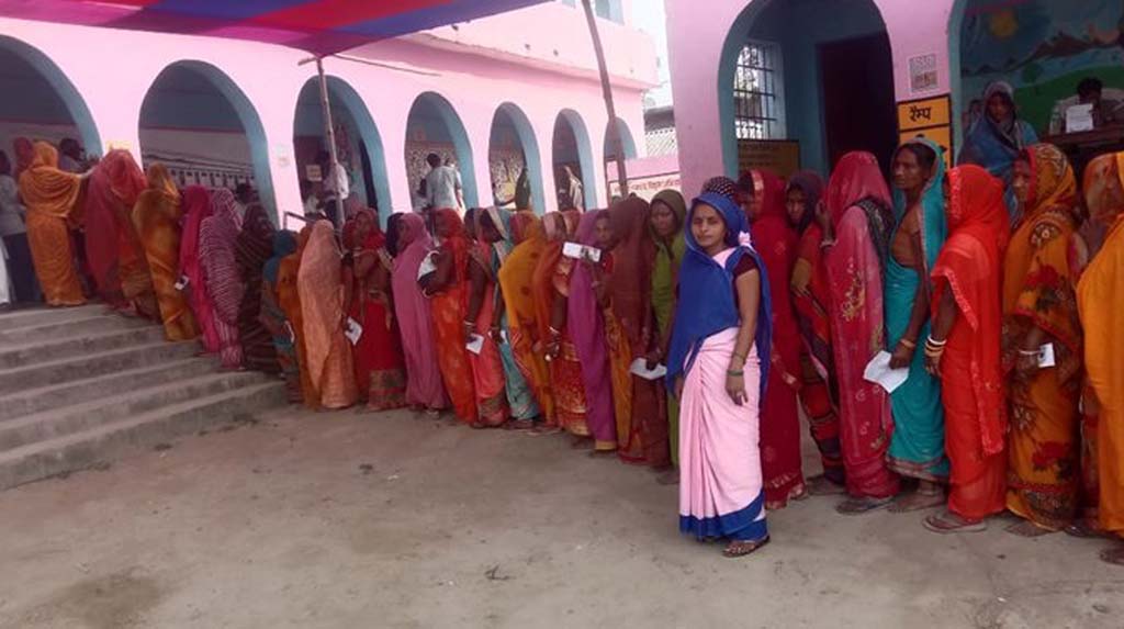 ଉତ୍ତର ପ୍ରଦେଶର ବାହରାଇଚ୍ର ଏକ ମତଦାନ କେନ୍ଦ୍ରରେ ପାରମ୍ପରିକ ପୋଷାକ ପିନ୍ଧିଥିବା ଥାରୁ ଜନଜାତିର ମତଦାତାମାନେ।
