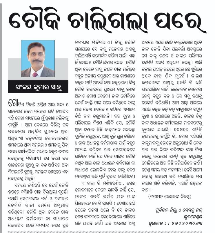 ଏହାହିଁ ସମୟ ଓ ଚୌକି ଯିବାର ଖେଳ। ଚୌକି ଥିବା ବେଳେ ବାବୁ ଜଣକ ତାଙ୍କ ମର୍ଜୀରେ ବହୁତ ଅନ୍ୟାୟ କରୁଥିବେ ଆଉ ଭାଷଣରେ ବହୁତ ନୀତି ଆଦର୍ଶ କଥା କହୁଥିବେ। କିନ୍ତୁ ଚୌକି ଗଲାପରେ ପ୍ରଥମେ ବାବୁ ଜଣକ ଅନ୍ୟର ଦୋଷ ଦେବେ। ତାଙ୍କ ଚୌକିରେ ଯେଉଁ ବ୍ୟକ୍ତି ତାଙ୍କ ପରେ ବସିଥିବେ ତାଙ୍କୁ ଆଗ ଦୋଷ ଦେବେ ଓ କହିବେ ଏମାନେ କିଛି କାମ କରୁନାହାନ୍ତି। ବଡ ଦୁଃଖ ଓ ପରିତାପର ବିଷୟ ଏହିକି ଯେ ଚୌକି ଥିବା ବେଳେ କିଛି ବାବୁମାନେ ମନଇଚ୍ଛା ଦୁର୍ନୀତି କରୁଥିବେ, ଆଖି ବୁଜି ଭୁଲ୍ କରିବେ ଓ ତାଙ୍କ ଅଧିନସ୍ଥ କର୍ମଚାରୀଙ୍କ ପାଇଁ ବହୁତ ଅନ୍ୟାୟ କରିବେ ଆଉ ସେତେବେଳେ ଭାବିବେ ନାହିଁ ଯେ ଦିନେ ତାଙ୍କର ଚୌକି ନଥିବ ଆଉ ତାଙ୍କ ଅଧିନସ୍ଥ କର୍ମଚାରୀ ବା ସାଧାରଣ ଲୋକଟିଏ ହେଉ ତାକୁ ଦେଖି ନ ଦେଖିଲା ଭଳି ମୁହଁ ବୁଲାଇ ଚାଲିଯିବେ। ଏ ଭଲା କି ମଣିଷପଣିଆ, ସେଇ ଲୋକମାନେ କେବେ ଭାବନ୍ତି ନାହିଁ ଯେ ତାଙ୍କର ଏପରି କର୍ମର ଫଳ ତାଙ୍କ ପିଲାମାନେ ଭୋଗି ପାରନ୍ତି ଓ ଦେଖାଯାଇଛି ଯେତେ ପଇସା ଥିଲେ ବି ସେ ତାଙ୍କର ଶେଷ ଜୀବନରେ କେବେହେଲେ ଶାନ୍ତିରେ ରହି ପାରନ୍ତି ନାହିଁ। ଯଦି ଆପଣଙ୍କ ଆଖି ଆଗରେ ଏପରି କେହି ବ୍ୟକ୍ତି ବିଶେଷ ଥିବେ ତାଙ୍କ ଚୌକି ଯିବା ପରବର୍ତ୍ତୀ ଅବସ୍ଥାରେ ସେ ବାବୁ ଜଣକ ଓ ତାଙ୍କର ପରିବାର କେମିତି ଅଛନ୍ତି ଅନୁଧ୍ୟାନ କରନ୍ତୁ। ଖାଲି ଟଙ୍କାର ପାହାଡ ଉପରେ ଥିଲେ ଯେ ଖୁସିରେ ଥିବେ ତାହା ଠିକ ନୁହଁ କାରଣ ଭଗବାନଙ୍କ ଆଖିରୁ କେହି ବି ଖସି ଯାଇପାରିବେ ନାହିଁ।