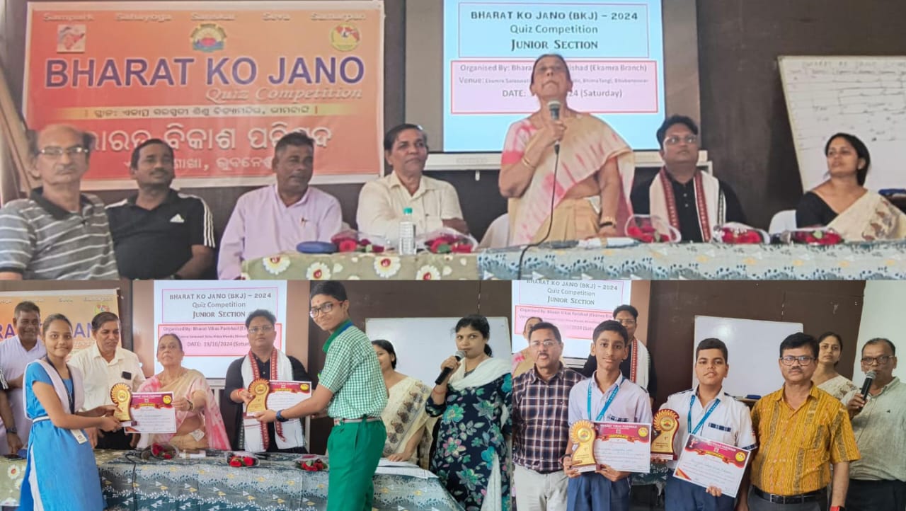 ସତ୍ୟବାଦୀ (ଦୁର୍ଗେଶ ପ୍ରସାଦ ମିଶ୍ର): ଭାରତ ବିକାଶ ପରିଷଦ, ଏକାମ୍ର ଶାଖା, ଭୁବନେଶ୍ୱର ଆନୁକୁଲ୍ୟରେ ଅକ୍ଟୋବର ୧୯ ତାରିଖରେ ଶାଖା ସ୍ତରୀୟ ଆନ୍ତଃ ବିଦ୍ୟାଳୟ “ଭାରତ କୋ ଜାନୋ” କୁଇଜ୍ ପ୍ରତିଯୋଗିତା ପୁରୁଣା ଭୁବନେଶ୍ବରସ୍ଥିତ ଏକାମ୍ର ସରସ୍ଵତୀ ଶିଶୁ ବିଦ୍ୟାମନ୍ଦିର, ଭୀମଟାଙ୍ଗୀରେ ଅନୁଷ୍ଠିତ ହୋଇଯାଇଛି l ସିନିୟର୍ ବର୍ଗରେ ୮ ଟି ଓ ଜୁନିୟର ବର୍ଗରେ ୬ଟି ବିଦ୍ୟାଳୟ ର ୨୮ ଜଣ ପ୍ରତିଯୋଗୀଙ୍କ ମଧ୍ୟରେ ଆମ ଦେଶ ଭାରତ ଉପରେ ପର୍ଯ୍ୟବେସିତ ପ୍ରଶ୍ନ ଦ୍ଵାରା ଚୟନ ପ୍ରକ୍ରିୟା ନିର୍ଦ୍ଧାରିତ ହୋଇଥିଲା l ଏହି ପ୍ରତିଯୋଗିତାକୁ କୁଇଜ୍ ମାଷ୍ଟର ଡ଼. ହେମନ୍ତ ମିଶ୍ର ପରିଚାଳନା କରିଥିଲେ l ଭାରତ ବିକାଶ ପରିଷଦ, ଓଡିଶା ପୂର୍ବପ୍ରାନ୍ତ ମିଡ଼ିଆ ପ୍ରଭାରୀ ନିହାର ରଞ୍ଜନ ସ୍ୱାଇଁ ପର୍ଯ୍ୟବେକ୍ଷକ ଭାବରେ ଏବଂ ବରିଷ୍ଠ ସଦସ୍ୟା ତଥା ପ୍ରଭାରୀ ଗୀତା ପଟ୍ଟନାୟକ ମୁଖ୍ୟଅତିଥି ରୂପେ ଯୋଗଦେଇ ଥିବାବେଳେ ପୂର୍ବପ୍ରାନ୍ତ ଅର୍ଥ ସଚିବ ନରସିଂହ ମିଶ୍ର ଏବଂ ଏକାମ୍ର ସରସ୍ଵତୀ ଶିଶୁ ବିଦ୍ୟାମନ୍ଦିରର ପ୍ରଧାନ ଆଚାର୍ଯ୍ୟ ସୁରେଶ ଚନ୍ଦ୍ର ବେହେରା ସମ୍ମାନିତ ଅତିଥି ରୂପେ ଯୋଗଦେଇ କାର୍ଯ୍ୟକ୍ରମକୁ ଦିଗଦର୍ଶନ ଦେବା ସହିତ ପ୍ରତିଯୋଗୀମାନଙ୍କୁ ଭାରତ ବର୍ଷର ସଂସ୍କୃତି ଓ ଐତିହ୍ୟ ସହିତ ନିଜକୁ ପରିଚିତ କରିବା ପାଇଁ ଉପଦେଶ ଦେଇଥିଲେ l ପ୍ରଥମ ସ୍ଥାନ ଅଧିକାର କରିଥିବା କନିଷ୍ଠ ବର୍ଗରେ ବକ୍ସି ଜଗବନ୍ଧୁ ଇଂଲିଶ ମିଡ଼ିଅମ୍ ସୁଲ, ବିଜେବି ନଗର ଏବଂ ବରିଷ୍ଠ ବର୍ଗରେ ସରକାରୀ ଉଚ୍ଚ ବିଦ୍ୟାଳୟ,, ୟୁନିଟ-୧ ର ପ୍ରତିଯୋଗୀମାନେ ଆସନ୍ତା ନଭେମ୍ବର ମାସରେ ନୟାଗଡ଼ରେ ହେବାକୁଥିବା ପ୍ରାନ୍ତ ସ୍ତରୀୟ “ଭାରତ କୋ ଜାନୋ” ପ୍ରତିଯୋଗିତାରେ ଭାଗ ନେବା ପାଇଁ ମନୋନୀତ ହୋଇଥିଲେ l ସଭାପତି ପ୍ରଫେସର ଦେବେନ୍ଦ୍ର ମୋହନ ମିଶ୍ର, ସମ୍ପାଦିକା ରଶ୍ମିତା ପଣ୍ଡା ଓ କୋଷାଧ୍ୟକ୍ଷ ପ୍ରକାଶ ନାୟକଙ୍କ ବଳିଷ୍ଠ ନେତୃତ୍ୱ ଏଵଂ ପ୍ରଭାସ ମହାନ୍ତି, ଅନିଲ ଶତପଥୀ, ଅଶୋକ ପଟ୍ଟନାୟକ, ଦୁଃଖୀଶ୍ୟାମ ଦାଶ ଓ ଅନ୍ୟ ସଭ୍ୟମାନଙ୍କ ସହାୟତାରେ କାର୍ଯ୍ୟକ୍ରମଟି ସୁଚାରୁରୂପେ ସମ୍ପାଦିତ ହୋଇଥିଲା l ଶେଷରେ କୃତି ପ୍ରତିଯୋଗୀମାନଙ୍କୁ ପୁରସ୍କାର ବିତରଣ କରାଯାଇଥିଲା l