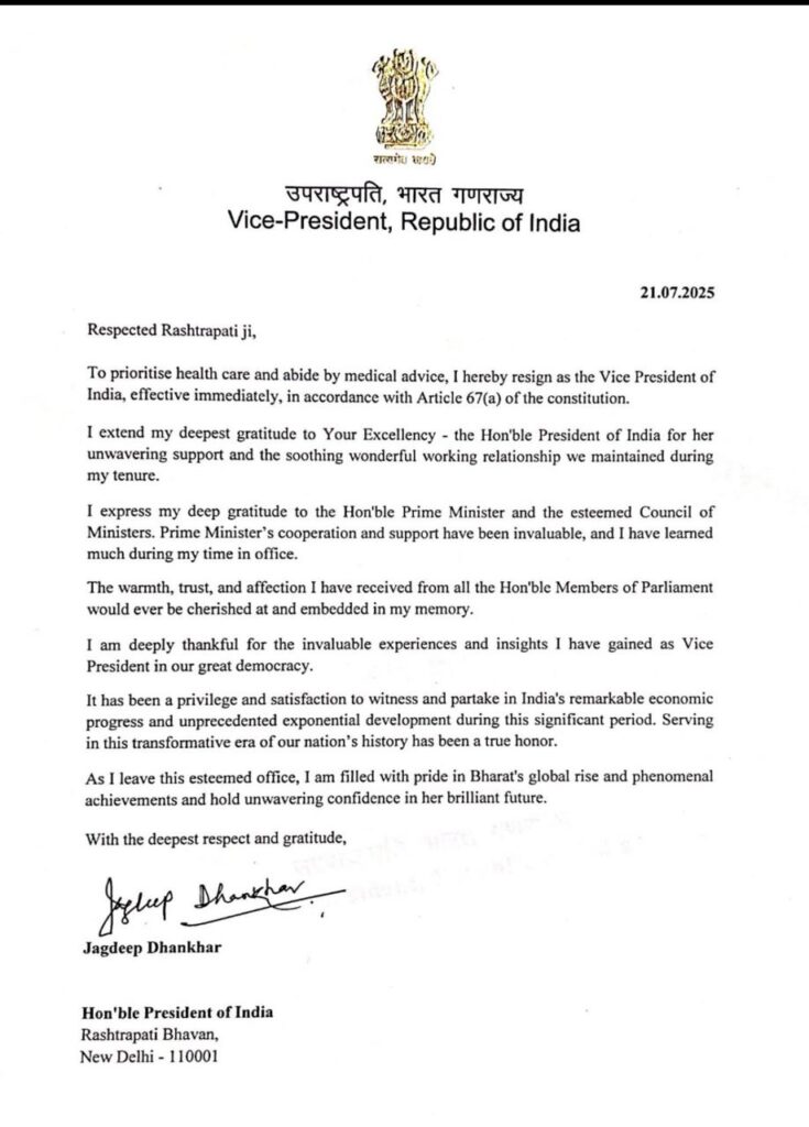 ଚିକିତ୍ସାକୁ ପ୍ରାଥମିକତା ଓ ଡାକ୍ତରଙ୍କ ପରାମର୍ଶ ପାଳନ କରି ସେ ଉପରାଷ୍ଟ୍ରପତି ପଦରୁ ଇସ୍ତଫା ଦେଇଥିବା ଲେଖିଛନ୍ତି । ଏହାସହ ସହଯୋଗ ଓ ସୁସମ୍ପର୍କ ପାଇଁ ସେ ରାଷ୍ଟ୍ରପତିଙ୍କୁ ଧନ୍ୟବାଦ ଦେଇଛନ୍ତି । କେବଳ ସେତିକି ନୁହେଁ ପ୍ରଧାନମନ୍ତ୍ରୀ ଓ ମନ୍ତ୍ରୀମଣ୍ଡଳର ସହଯୋଗ ପାଇଁ ସେ କୃତଜ୍ଞ ବୋଲି ଉଲ୍ଲେଖ କରିଛନ୍ତି ।