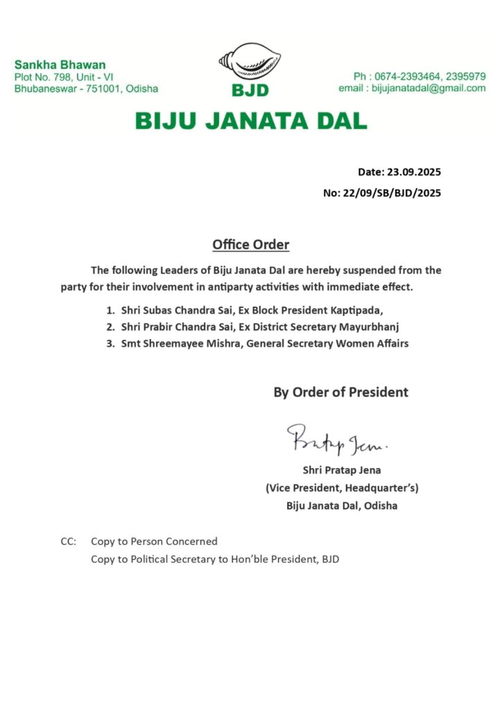 ଶ୍ରୀମୟୀ ବିଜେଡିରେ ମହିଳା ବ୍ୟାପାର ସାଧାରଣ ସମ୍ପାଦକ ପଦବୀରେ ଅବସ୍ଥାପିତ ରହିଥିଲେ। କିଛି ଦିନ ହେବ ସେ ସାମାଜିକ ଗଣମାଧ୍ୟମରେ ଦଳ ବିରୋଧରେ ବିଭିନ୍ନ ମନ୍ତବ୍ୟ ଦେଇଆସୁଥିଲେ। ଧୃତରାଷ୍ଟ୍ର ଏବଂ ଭଣ୍ଡ ସନ୍ନ୍ୟାସୀ ଉପାଖ୍ୟାନରେ ଦଳର ମଙ୍ଗୁଆଳଙ୍କୁ କଟାକ୍ଷ କରି ଚର୍ଚ୍ଚାରେ ରହିଥିଲେ। ସେହି କାରଣରୁ ତାଙ୍କ ବିରୋଧରେ କାର୍ଯ୍ୟାନୁଷ୍ଠାନ ନିଆଯାଇଥିବା କୁହାଯାଇଛି। ଶ୍ରୀମୟୀଙ୍କ ବ୍ୟତୀତ କପ୍ତିପଦା ବ୍ଲକର ପୂର୍ବତନ ସଭାପତି ସୁବାସ ଚନ୍ଦ୍ର ସାଇ ଏବଂ ମୟୂରଭଞ୍ଜର ପୂର୍ବତନ ଜିଲା ସମ୍ପାଦକ ପ୍ରବୀର ଚନ୍ଦ୍ର ସାଇଙ୍କୁ ମଧ୍ୟ ବିଜେଡିରୁ ନିଲମ୍ବିତ କରାଯାଇଥିବା ବିବୃତିରେ ସୂଚନା ଦିଆଯାଇଛି।
