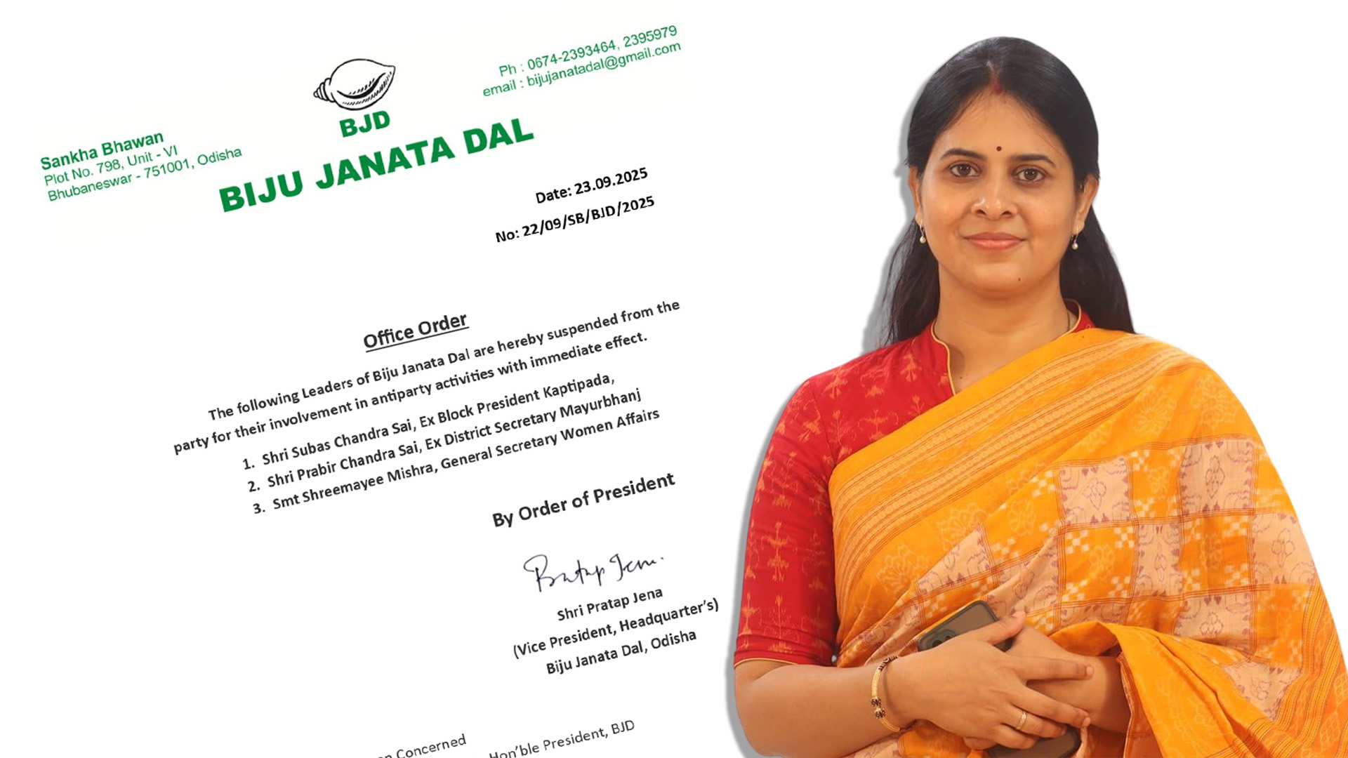 ଶ୍ରୀମୟୀ ବିଜେଡିରେ ମହିଳା ବ୍ୟାପାର ସାଧାରଣ ସମ୍ପାଦକ ପଦବୀରେ ଅବସ୍ଥାପିତ ରହିଥିଲେ। କିଛି ଦିନ ହେବ ସେ ସାମାଜିକ ଗଣମାଧ୍ୟମରେ ଦଳ ବିରୋଧରେ ବିଭିନ୍ନ ମନ୍ତବ୍ୟ ଦେଇଆସୁଥିଲେ। ଧୃତରାଷ୍ଟ୍ର ଏବଂ ଭଣ୍ଡ ସନ୍ନ୍ୟାସୀ ଉପାଖ୍ୟାନରେ ଦଳର ମଙ୍ଗୁଆଳଙ୍କୁ କଟାକ୍ଷ କରି ଚର୍ଚ୍ଚାରେ ରହିଥିଲେ। ସେହି କାରଣରୁ ତାଙ୍କ ବିରୋଧରେ କାର୍ଯ୍ୟାନୁଷ୍ଠାନ ନିଆଯାଇଥିବା କୁହାଯାଇଛି। ଶ୍ରୀମୟୀଙ୍କ ବ୍ୟତୀତ କପ୍ତିପଦା ବ୍ଲକର ପୂର୍ବତନ ସଭାପତି ସୁବାସ ଚନ୍ଦ୍ର ସାଇ ଏବଂ ମୟୂରଭଞ୍ଜର ପୂର୍ବତନ ଜିଲା ସମ୍ପାଦକ ପ୍ରବୀର ଚନ୍ଦ୍ର ସାଇଙ୍କୁ ମଧ୍ୟ ବିଜେଡିରୁ ନିଲମ୍ବିତ କରାଯାଇଥିବା ବିବୃତିରେ ସୂଚନା ଦିଆଯାଇଛି।