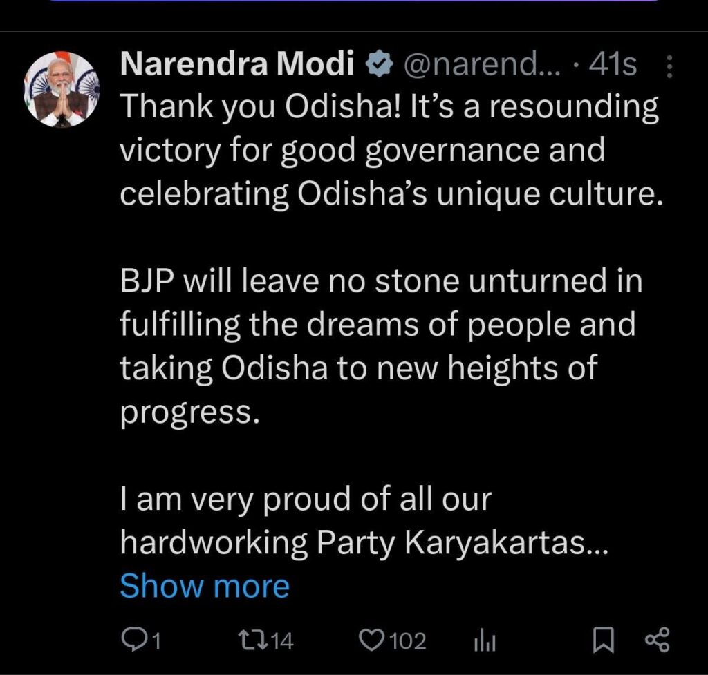 ଓଡ଼ିଶାରେ ବିଜେପିର ବିଜୟ: ଧନ୍ୟବାଦ୍ ଜଣାଇଲେ ପ୍ରଧାନମନ୍ତ୍ରୀ ମୋଦି