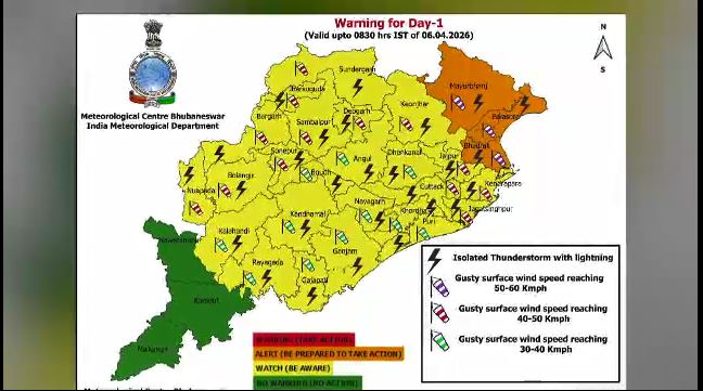 ଆଗାମୀ ଦୁଇ ଦିନରେ ତାପାମାତ୍ର ୨ରୁ ୪ ଡିଗ୍ରୀ କମିପାରେ ।ଆଜି ରାଜ୍ୟର ଅଧିକାଂଶ ଜିଲ୍ଲାରେ ବିଜୁଳି ଘଡ଼ଘଡ଼ି ସହ ବର୍ଷା ସମ୍ଭାବନା ଅଛି। ବର୍ଷା ବେଳେ ୪୦ ରୁ ୫୦ କିଲୋମିଟର ବେଗରେ ପବନ ବହିପାରେ। ବାଲେଶ୍ବର, ଭଦ୍ରକ ଏବଂ ମୟୂରଭଞ୍ଜକୁ ଅରେଞ୍ଜ ୱାର୍ଣ୍ଣିଂ ଜାରି କରିଛି ପାଣିପାଗ ବିଭାଗ। ସେହିପରି ୨୪ ଜିଲ୍ଲାକୁ ୟେଲୋ ୱାର୍ଣ୍ଣିଂ ଜାରି ହୋଇଛି । କାଲି ବିଜୁଳି ଓ ଘଡଘଡି ପାଇଁ ୨୬ ଜିଲ୍ଲାକୁ ୟେଲୋ ଆଲର୍ଟ ଜାରି ହୋଇଛି । ସେହିପରି ୭ ତାରିଖ ଏବଂ ୮ ତାରିଖ ପାଇଁ ୪ ଜିଲ୍ଲାକୁ ଅରେଞ୍ଜ ଆଲର୍ଟ ଜାରି କରିଛି ପାଣିପାଗ ବିଭାଗ ।