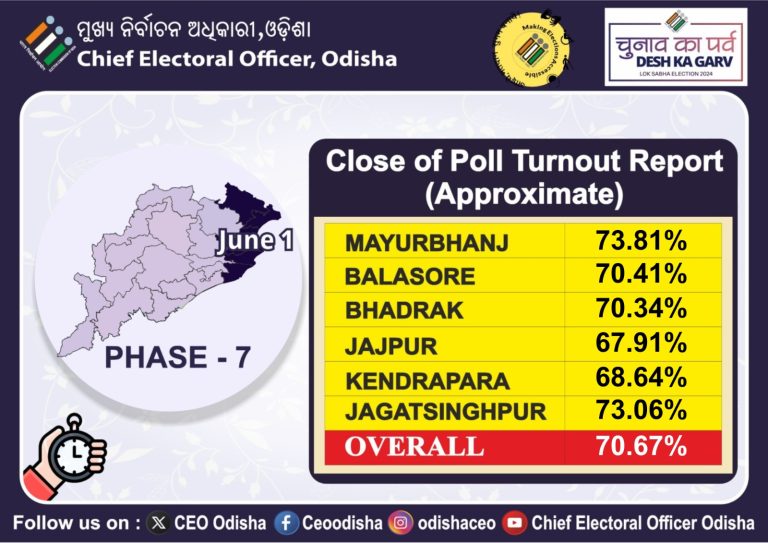 ଭୁବନେଶ୍ବର: ଗତକାଲି ଶେଷ ହୋଇଛି ଓଡିଶାର ଲୋକସଭା ଓ ବିଧାନସଭା ମତଦାନ। ତେବେ ଓଡିଶାରେ ଶେଷ ପର୍ଯ୍ୟାୟରେ କେତେ ମତଦାନ ହୋଇଛି ତାହାର ହିସାବ ଆଜି ଓଡିଶା ମୁଖ୍ୟ ନିର୍ବାଚନ ଅଧିକାରୀଙ୍କ କାର୍ଯ୍ୟାଳୟ ତରଫରୁ ଜାରି କରାଯାଇଛି। ସେହି ଅନୁସାରେ ଗତକାଲି ଓଡିଶାର ମତଦାନ ହାର ଥିଲା ୭୦.୬୭ ପ୍ରତିଶତ। ସେହିପରି ଗତକାଲି ହୋଇଥିବା ଛଅଟି ଲୋକସଭା ଆସନର ହାରକୁ ଲକ୍ଷ୍ୟ କଲେ ମୟୂରଭଞ୍ଜରେ ସର୍ବାଧିକ ଭୋଟ ହୋଇଛି। ସେହିପରି ଦ୍ହିତୀୟରେ ରହିଛି ଜଗତସିଂହପୁର ଲୋକସଭା କ୍ଷେତ୍ର। ତେବେ ଏଥିରେ ପୋଷ୍ଟାଲ ବାଲଟ ହିସାବକୁ ନିଆଯାଇ ନାହିଁ।